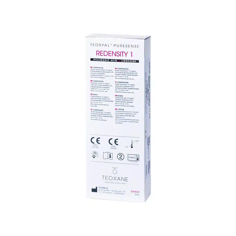 Teosyal PureSense Redensity is a unique hyaluronic acid-based skin enhancer which prevents premature skin from aging, restores skin density and maintains skin glow. PureSense Redensity is suitable for the face, neck and also neckline, where skin is showing signs of dryness, cutaneous slackening, sun damage and aging. Used to add density to the dermis.